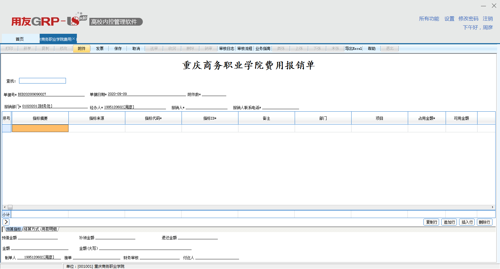 一、填报“重庆商务职业学院费用报销单”或“重庆商务职业学院差旅费报销单”时,单击工具栏上 的“附件”按钮。