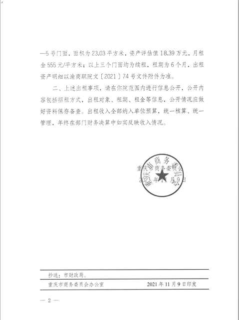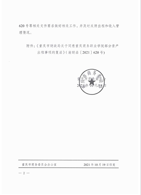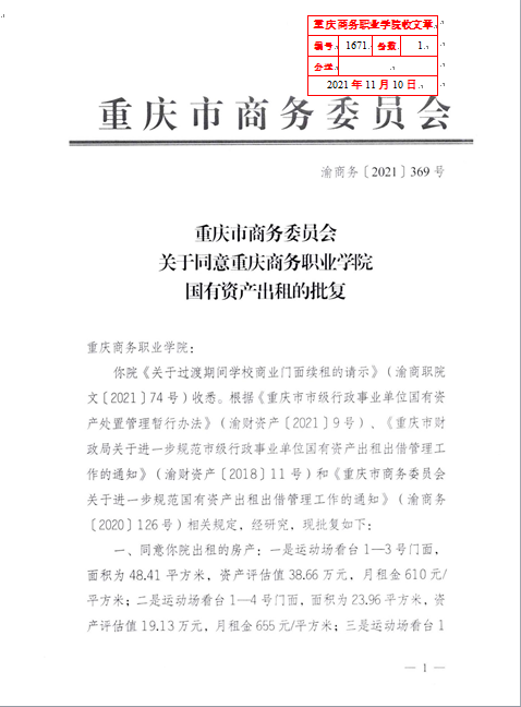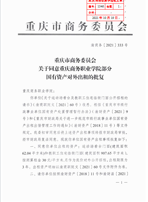 附件: 1.重庆市商务委员会关于同意重庆商务职业学院国有资产出租的批复(渝商务〔2021〕369号)