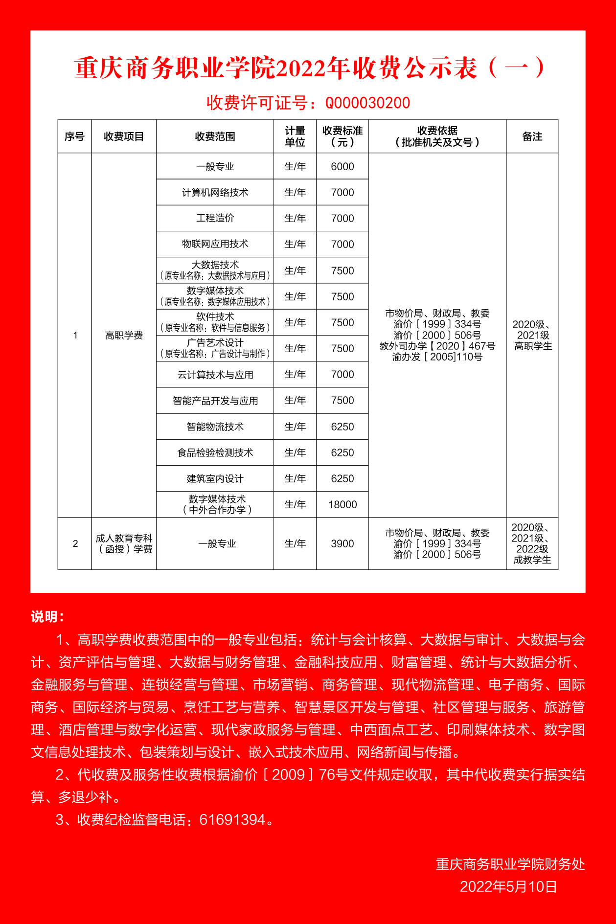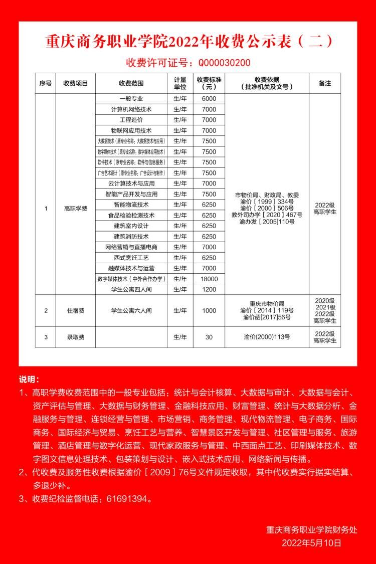 重庆商务职业学院2022年收费公示表