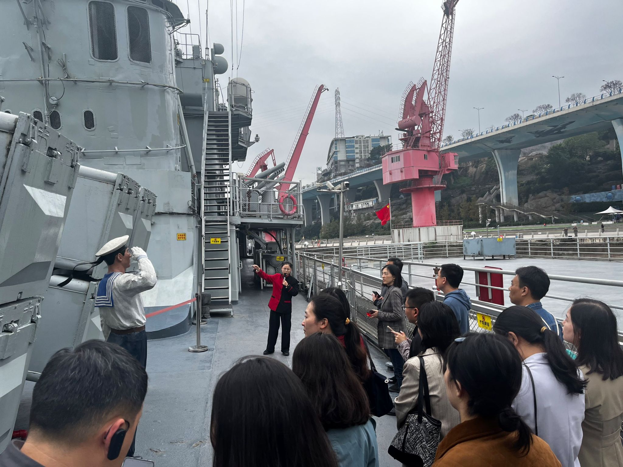重庆建川海疆博物馆作为我国内陆首个以军舰为主题的特色博物馆集群,由岸畔“未来军舰”造型主馆与江上退役166舰陈列展共同构成,形成“岸舰呼应、水陆联动”的独特展陈格局。馆内珍藏1500余件海疆相关文物史料,系统呈现“人民海军向前进”的光辉历程,而退役的166舰作为“镇馆之宝”,曾劈波斩浪守护海疆,如今以爱国主义教育基地的身份续写荣光,其主船体与上层建筑展区中,水兵生活用品、舰上专用器材等实物展品,生动还原了海军官兵的坚守与担当。在讲解员引导下,党员们先后参观了海疆历史展区、166舰驾驶舱、武器装备区等核心区域,通过沉浸式观摩、多媒体演示、实物触摸等方式,详细了解了166舰从建造服役到退役“安家”的完整历程,深刻感悟人民海军从无到有、从小到大、从弱到强的奋斗精神;在舰艇甲板上,全体党员庄严肃立,面向党旗重温入党誓词,铮铮誓言与江风共鸣,进一步坚定了坚持为党育人、为国育才的初心使命与守护蓝色国土的责任担当。