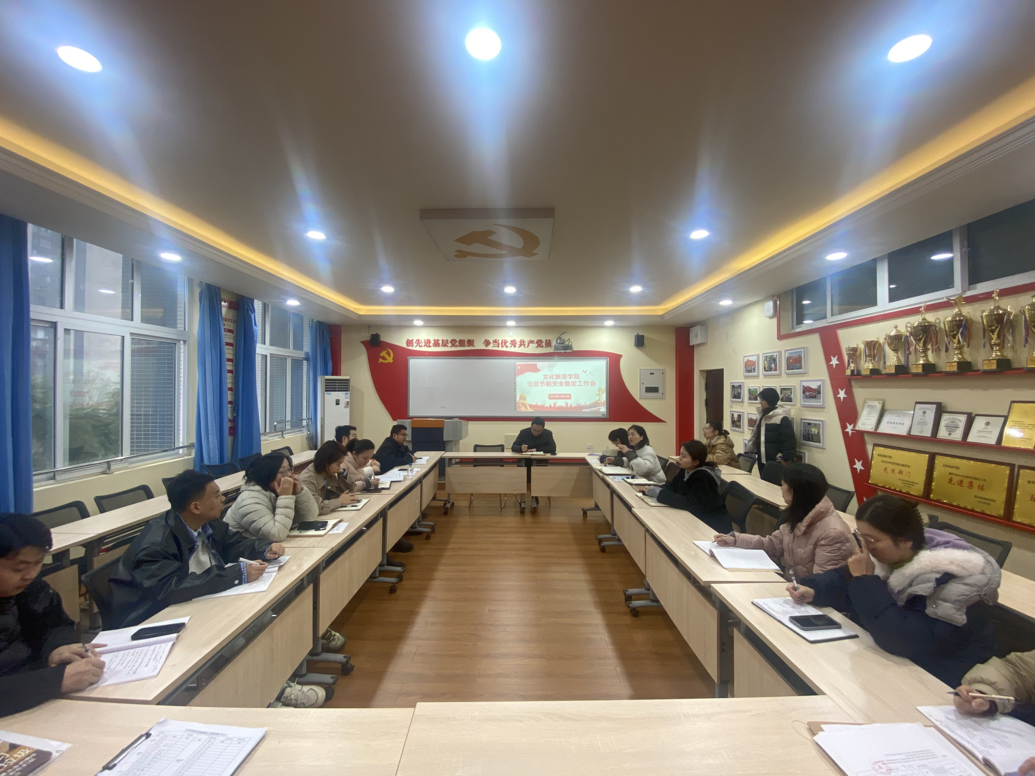 为切实筑牢节日期间安全防线,保障全院师生生命财产安全与校园和谐稳定,在元旦佳节来临之际,文化旅游学院召开元旦节前安全稳定工作专题会议。会议由学团办副主任罗映芳主持,学院党总支书记莫灼宇、副书记副院长马建林、教学教务办及学团办全体专兼职辅导员参会。