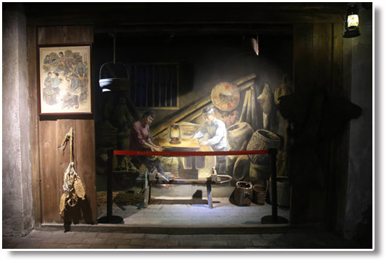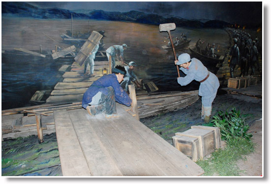 这里再现了当年搭建渡河浮桥时的情景。于都河,中央红军出发长征时要渡过的第一条大河。当时河面宽600多米,水流深湍,大部队要过河就只有架设浮桥。为保证红军顺利渡河,当时沿河所有民船全部停运,共调集了800多条大小船只,有的用作架设浮桥,有的用作摆渡。