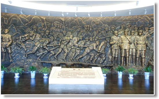 序厅里,这面大型浮雕墙展现了红军出发、于都儿女送别红军以及长征胜利的情景。1934年10月,于都百姓找来800多条船,架成5座浮桥,组成一支船队,帮助中央苏区、中革军委机关及其直属部队和第一、三、五、八、九军团共8.6万余人,分别从8个渡口渡过于都河,踏上长征路。这8万多红军中,每5个人中就有一个于都人。