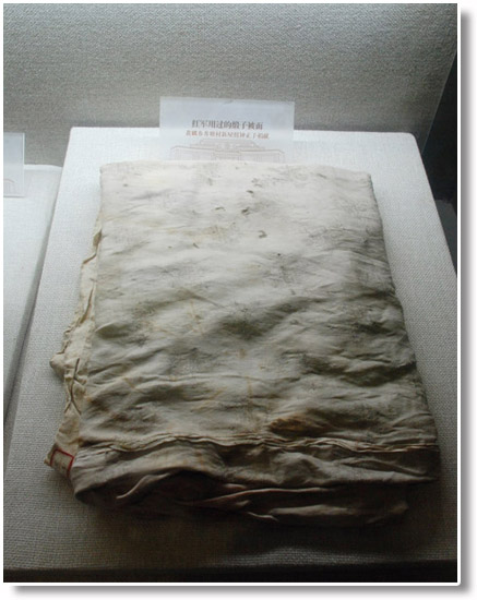 这是一床珍贵的绸缎被单。1934年12月,以项英、陈毅为领导的中共中央分局转移到黄麟乡井塘村,项英等中央领导被安排住在村民谢招娣家里。随后的日子,谢招娣时不时地送一些生活物品给红军战士,帮他们洗衣服、洗被褥。项英的妻子张亮和红军战士们也经常帮谢招娣犁田砍柴,长期的相处让彼此产生了深厚的感情。中央分局离开井塘村的头一天晚上,张亮把随身携带多年的一床绸缎被单送给了谢招娣。在以后的几十年里,谢招娣一直珍藏着这床绸缎被单,去世前她把被单交给家属钟正予,叮嘱他一定要保管好。