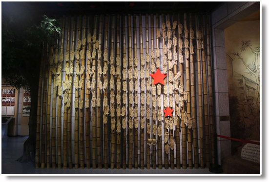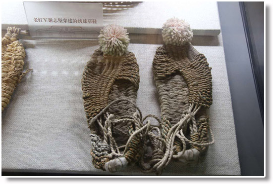 这是一幅在红军长征胜利80周年时用80双草鞋组成的中国地图。当年,苏区妇女夜以继日赶做了20万双草鞋献给红军。从东南到西北,从红土地到黄土地……那一支脚踏草鞋的队伍,从这里开始,跋山涉水、经历九死一生,将足印刻写在两万五千里漫漫征途。