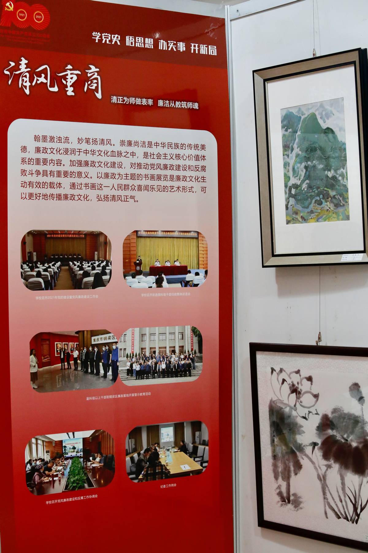 近日,重庆商务职业学院开展党史学习教育交流展,特别开设“清风重商”专栏,共展出纪检干部廉政书法、水墨画、素描、油画等作品56件,以翰墨激浊流、妙笔扬清风,用心用情传播校园廉洁文化。全校各级党组织、各班级积极组织党员、师生参观交流,观展人次累计达5000余人次。