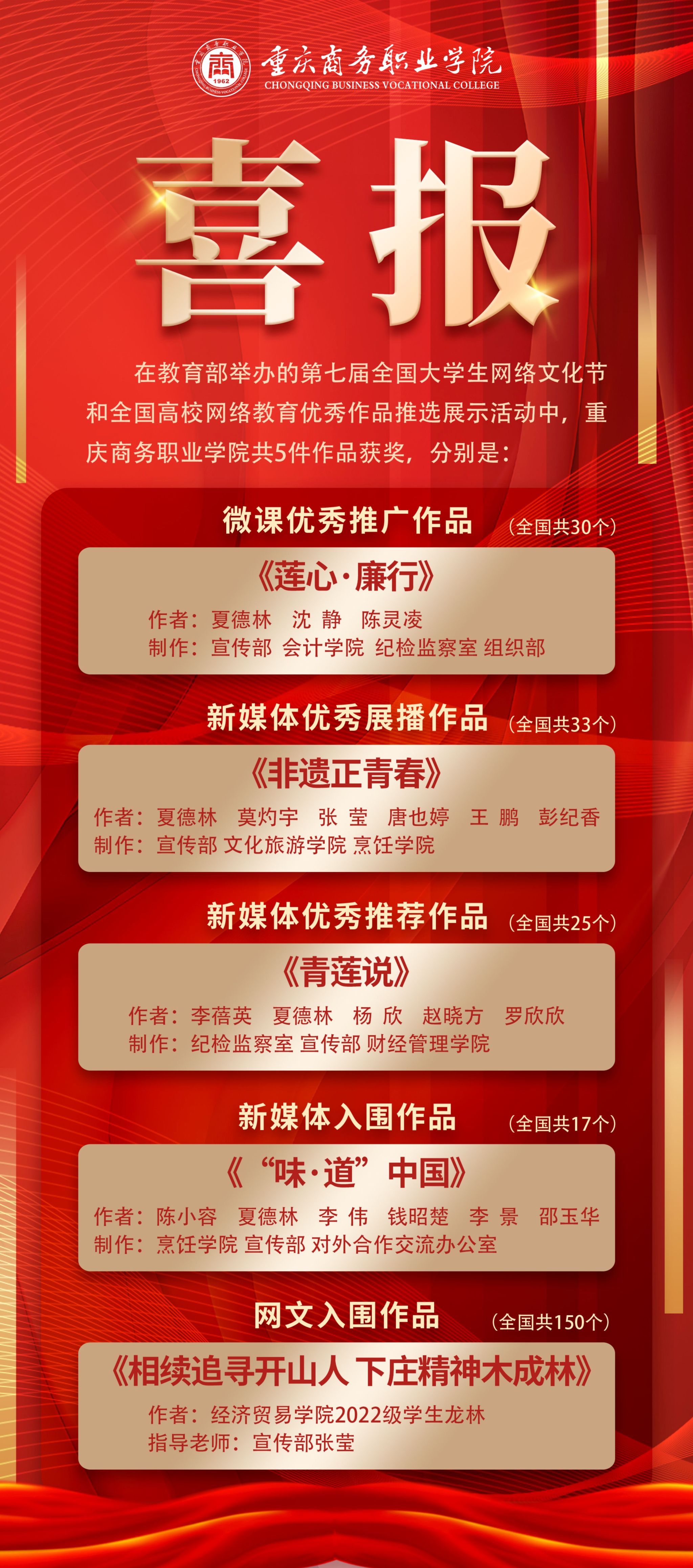 近日,教育部公布了第七届全国大学生网络文化节和全国高校网络教育优秀作品推选展示活动获奖作品名单。由学校纪委拍摄制作的廉洁文化作品《青莲说》获评全国新媒体优秀推荐作品。