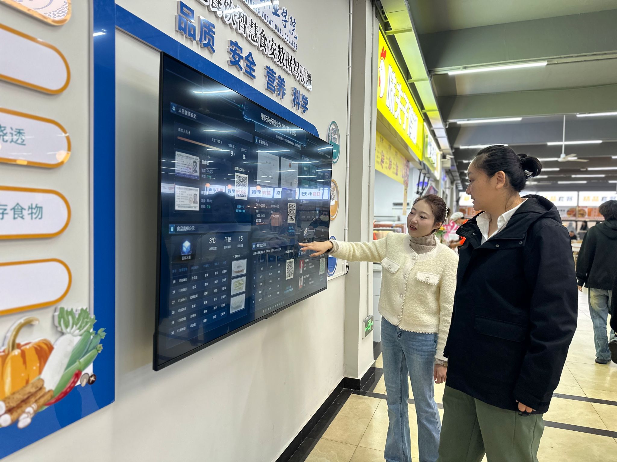 纪检监察干部核对南岸校区食堂餐饮智慧食安数据驾驶舱运行情况