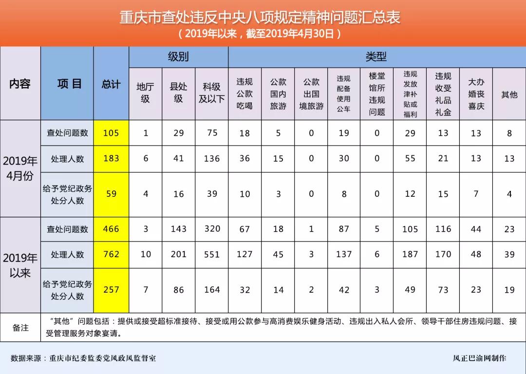 根据中央纪委要求,市纪委在全市纪检监察机关建立了查处违反中央八项规定精神问题月报制度。2019年以来,截至4月30日,全市查处违反中央八项规定精神问题情况如下: