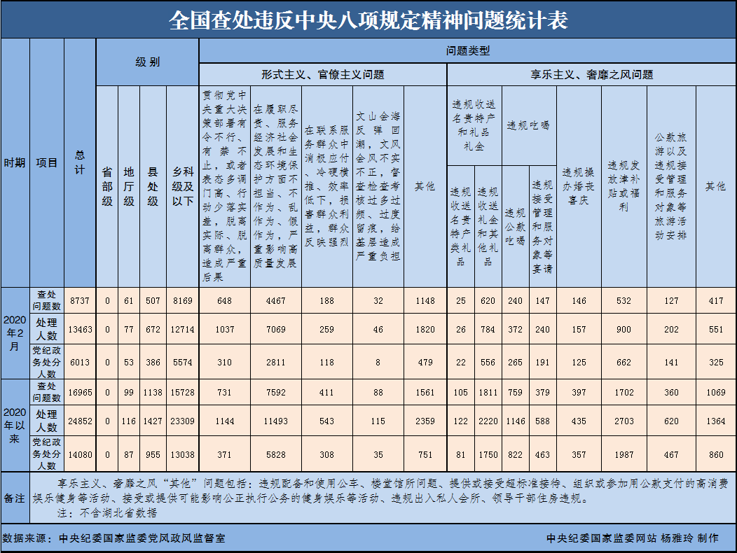 为掌握全国贯彻落实中央八项规定精神情况,中央纪委国家监委在各省区市和新疆生产建设兵团、各中央和国家机关、各中央企业和中央金融企业等建立了落实中央八项规定精神情况月报制度。2020年以来,截至2月29日,全国查处违反中央八项规定精神问题情况如下: