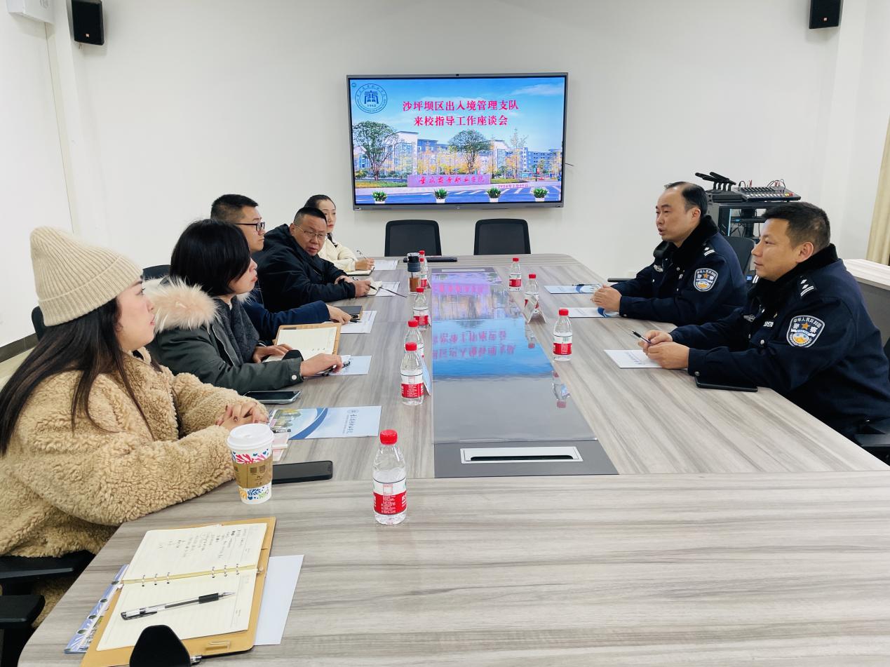 2月27日,沙坪坝区出入境管理支队警官来校走访交流指导国际学生、外籍教师管理服务工作。对外合作交流办公室、烹饪学院、经济贸易学院负责人及相关人员在417会议室参加会议。