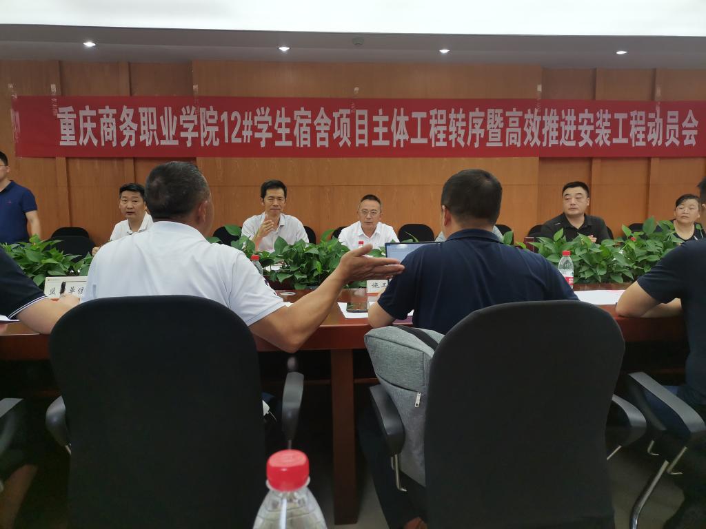 7月9日上午,后勤处组织召开学校12#学生宿舍项目主体工程转序暨安装工程推进动员会,会议由后勤处处长郑开禄主持,后勤处有关人员和施工、监理、跟踪审计等单位项目负责人及相关人员参加会议,党委书记谭勇、分管后勤工作副院长丁谦出席会议并讲话。