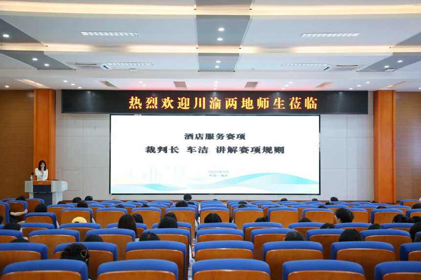 【文/教务处 】5月8日下午,第四届“川渝杯”职业院校学生技能大赛酒店服务、应用软件系统开发、英语口语、职业英语技能4个赛项的领队会在学校学术报告厅召开。本次大赛由重庆市教育委员会、四川省教育厅共同主办,共设置12个赛项,我校承办其中4个赛项。重庆市教科院赛项联系人、仲裁长谢红、傅渝稀、周劼,大赛裁判长车杰、向波,学校副校长李焱,川渝两地裁判、参赛团队师生及我校赛项工作人员参会。