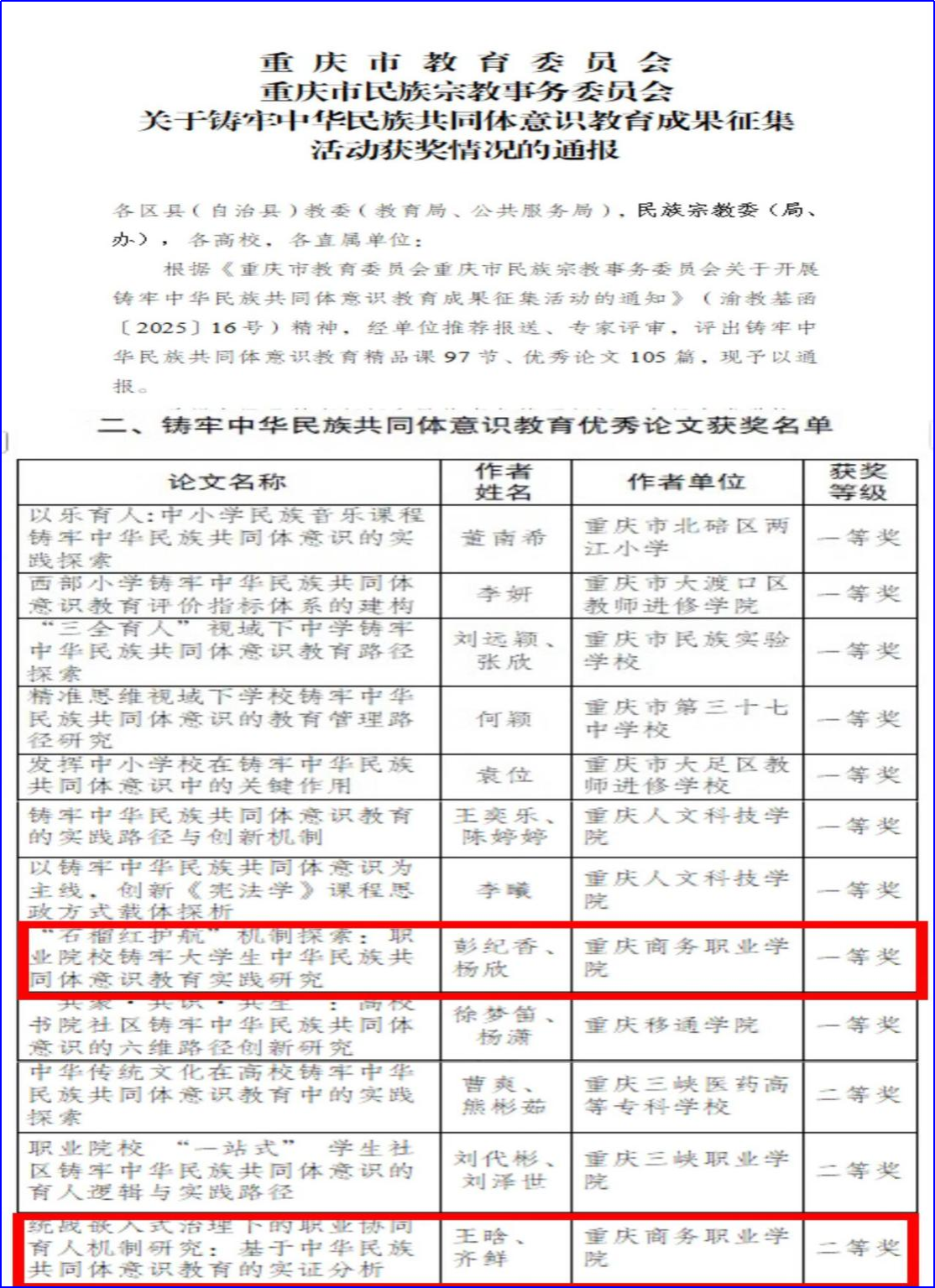 【文/图党委统战部】近日,重庆市教育委员会、重庆市民族宗教事务委员会联合发布《关于铸牢中华民族共同体意识教育成果征集活动获奖情况的通报》(渝教基函〔2025〕55号)。学校教师团队喜获佳绩。其中,彭纪香、杨欣撰写的论文《“石榴红护航”机制探索:职业院校铸牢大学生中华民族共同体意识教育实践研究》荣获一等奖;王晗、齐鲜撰写的论文《统战嵌入式治理下的职业协同育人机制研究:基于中华民族共同体意识教育的实证分析》荣获二等奖。