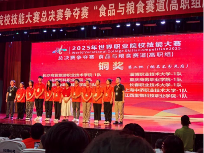 【文/图 烹饪与食品学院】8月26日,2025年世界职业院校技能大赛总决赛争夺赛食品与粮食赛道(高职组)在芜湖落下帷幕。学校烹饪与食品学院代表队在任红、王丽老师的指导下,由梁富、蓝万萍、王健诚三位同学组成的参赛队伍经过激烈角逐,最终荣获大赛铜奖。