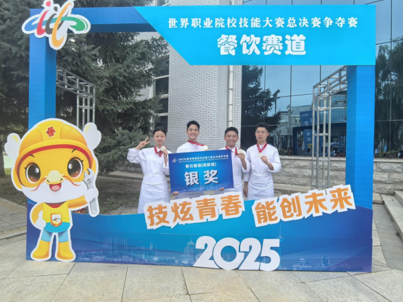本次大赛是教育部牵头组织的职业教育国际性高水平职业技能赛事。学校参赛队由指导教师冯勇、周占富,选手李函(2023级西式烹饪工艺专业)、陈浏阳(2023级烹饪工艺与营养专业)、苏木牛(2024级烹饪工艺与营养专业)、秦佳浩(2024级烹饪工艺与营养专业)四位学生组成。团队以扎实的专业技能、创新的菜品设计和默契的团队协作,从全国众多高职院校中脱颖而出,最终以小组第二名的成绩斩获“银奖”。