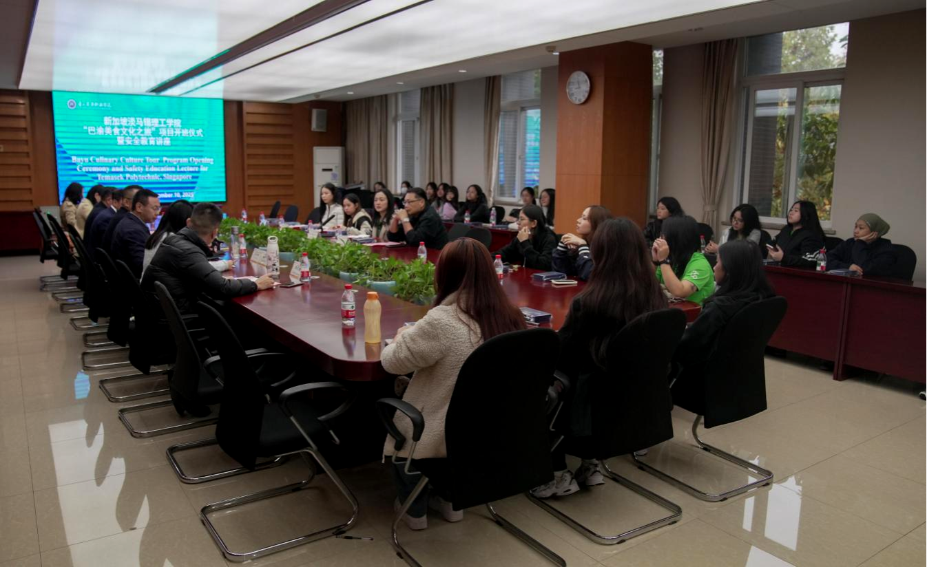 【文/对外合作交流中心 图/党委宣传部】11月10日上午,重庆商务职业学院暖意融融,新加坡淡马锡理工学院“巴渝美食文化之旅”项目开班仪式暨安全教育讲座在此举行。此次活动以美食文化为纽带,搭建起中新职业教育交流合作的坚实桥梁,为两国人文互联互通注入新活力。新加坡淡马锡理工学院应用科学学院食品、营养学与烹饪科学系副主任吴曼超(WU MANCHAO)、厨师讲师林福成(LIM HOCK SENG)及34名新加坡学子参会。重庆市中新示范项目管理局中新信息通信项目推进处处长马九鹏,学校党委委员、副校长贾小波,学校对外合作交流中心、通识教育学院(国际学院)、烹饪与食品学院相关人员参加活动。