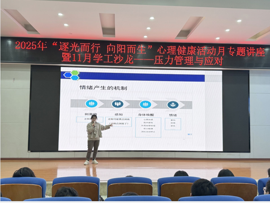 何敏副教授结合其二十余年深耕大学生心理健康领域的理论成果与实践积累,以“认识压力”与“压力管理”为主线,系统解析了压力的来源、类型及其生理机制。她通过生动案例,阐释了生物性、精神性以及社会环境性三类压力源的具体表现,并以“老虎来袭”为喻,形象说明了压力引发的生理反应与适应逻辑。何敏指出,压力的关键并不在其本身,而在于个体对压力的认知方式。在应对策略方面,她提出需关注压力适应过程中的警觉、搏斗与衰竭三阶段,警惕压力的“累积效应”;要积极构建多元社会支持系统,包括依靠家庭关怀、朋友互助与专业心理热线等资源,并特别提到“主动帮助他人”也是减轻压力危害的有效途径。