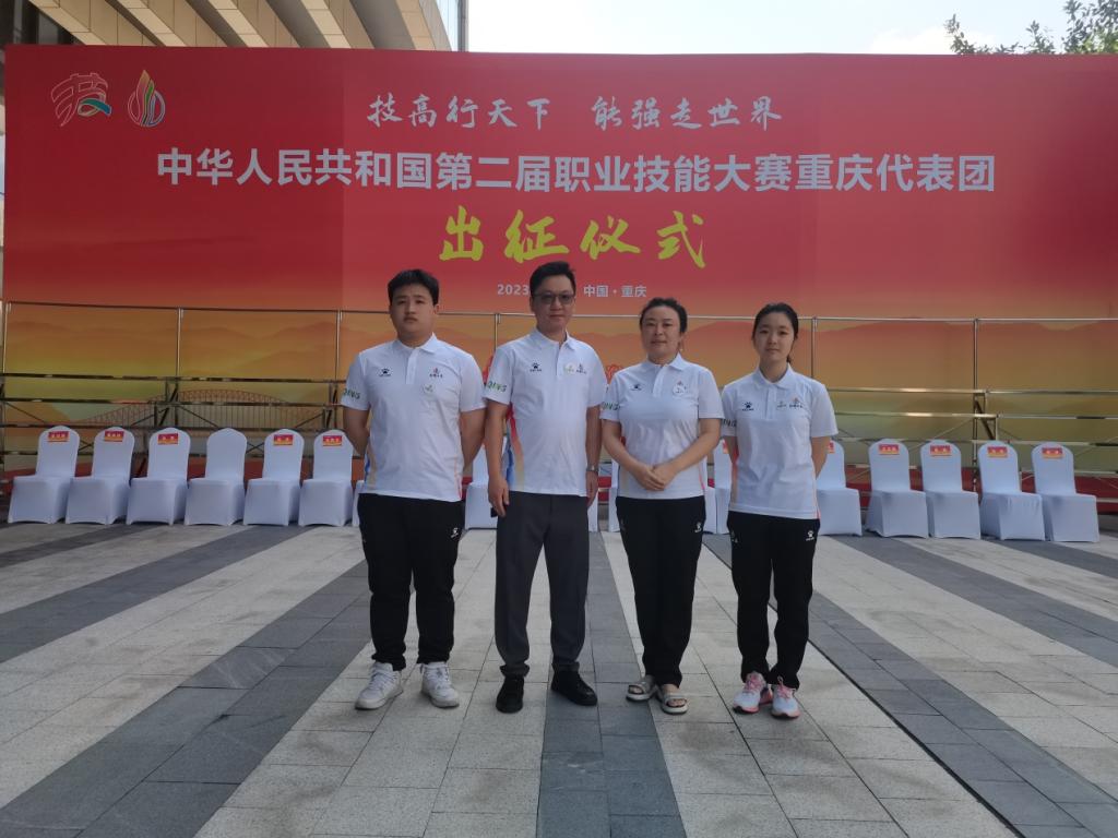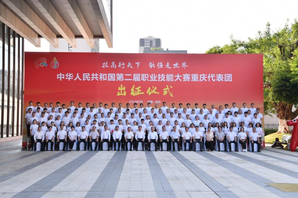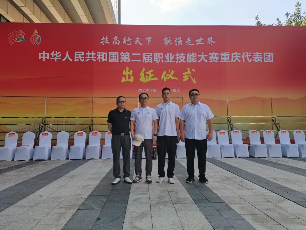 9月7日, 重庆市人力资源和社会保障局在中国·重庆人力资源服务产业园举行第二届全国技能大赛的重庆代表团全体成员出征仪式。由我校培养的烹饪(西餐)等五个项目选手、教练、裁判代表及相关部门负责人参加此次出征仪式。