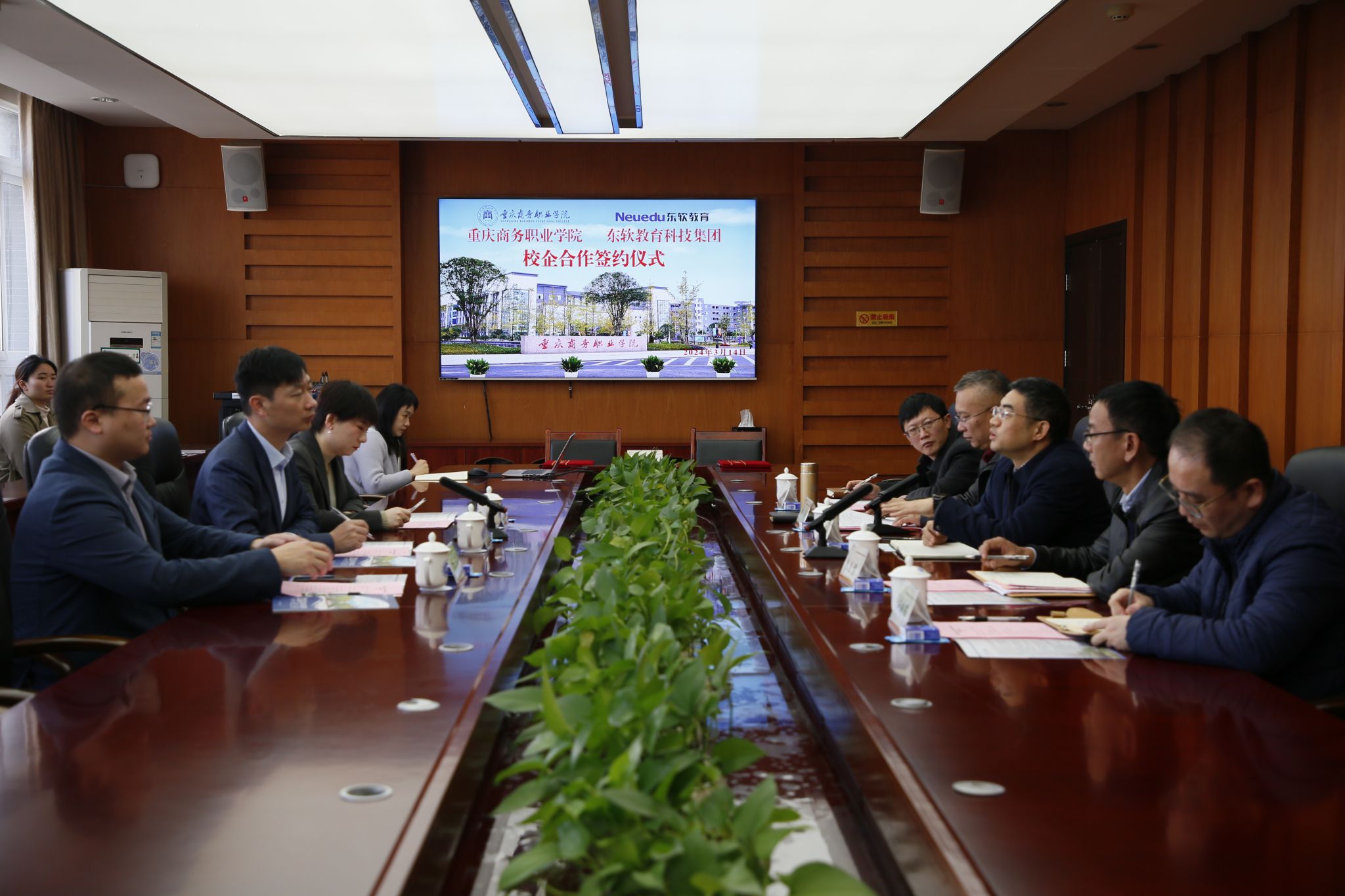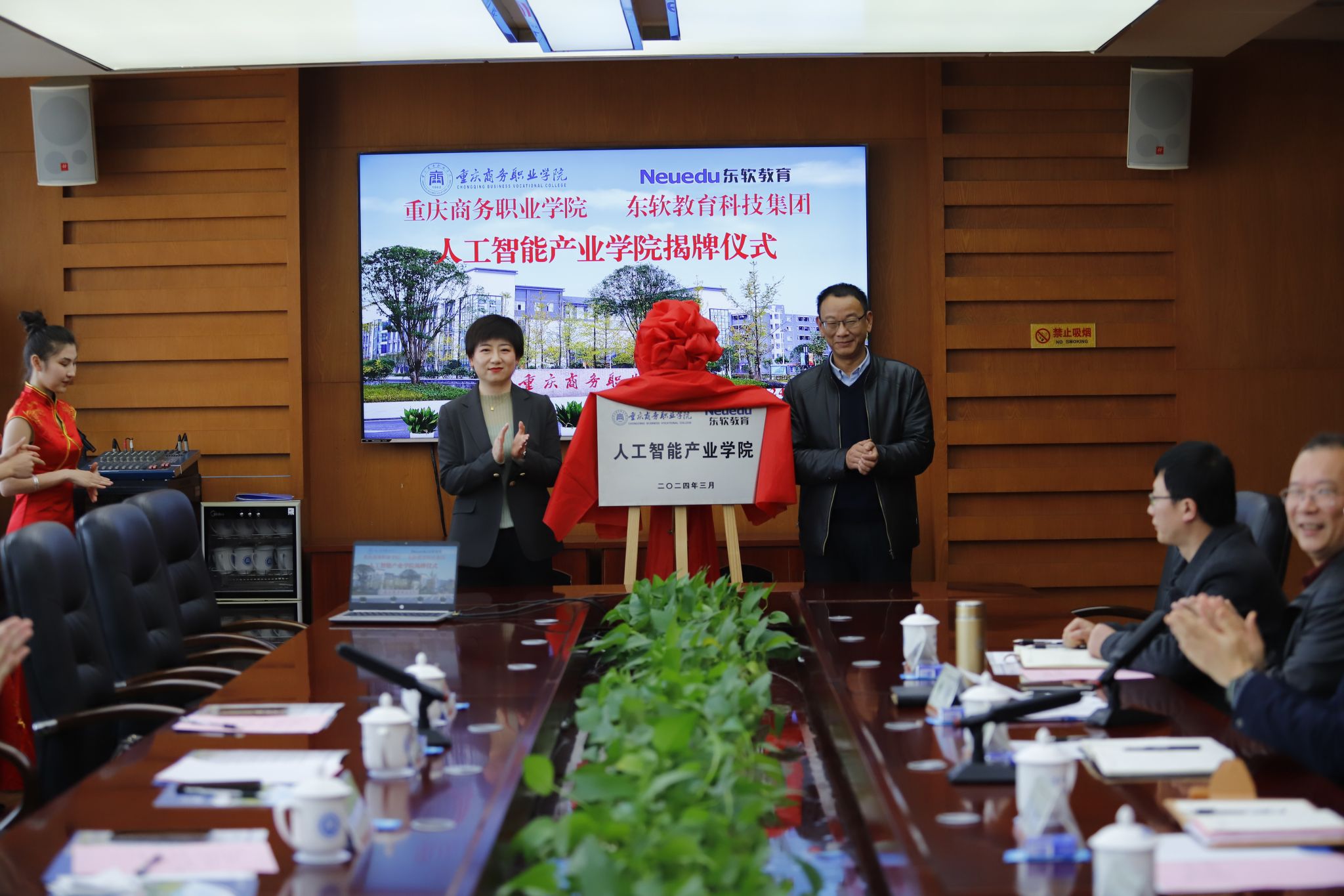 【文/教务处 图/党委宣传部】3月14日,学校与东软教育科技集团有限公司(以下简称“东软教育”)在第六会议室举行校企合作协议仪式,并正式揭牌成立“重庆商务学院东软人工智能产业学院”“东软教育重庆商务职业学院教师企业实践基地”。党委副书记、院长江涛,教务处、人工智能学院相关负责人,以及东软教育副总裁董本清、职业教育事业部副总经理惠慧、职业教育事业部市场销售管理中心副主任陈笛出席活动。