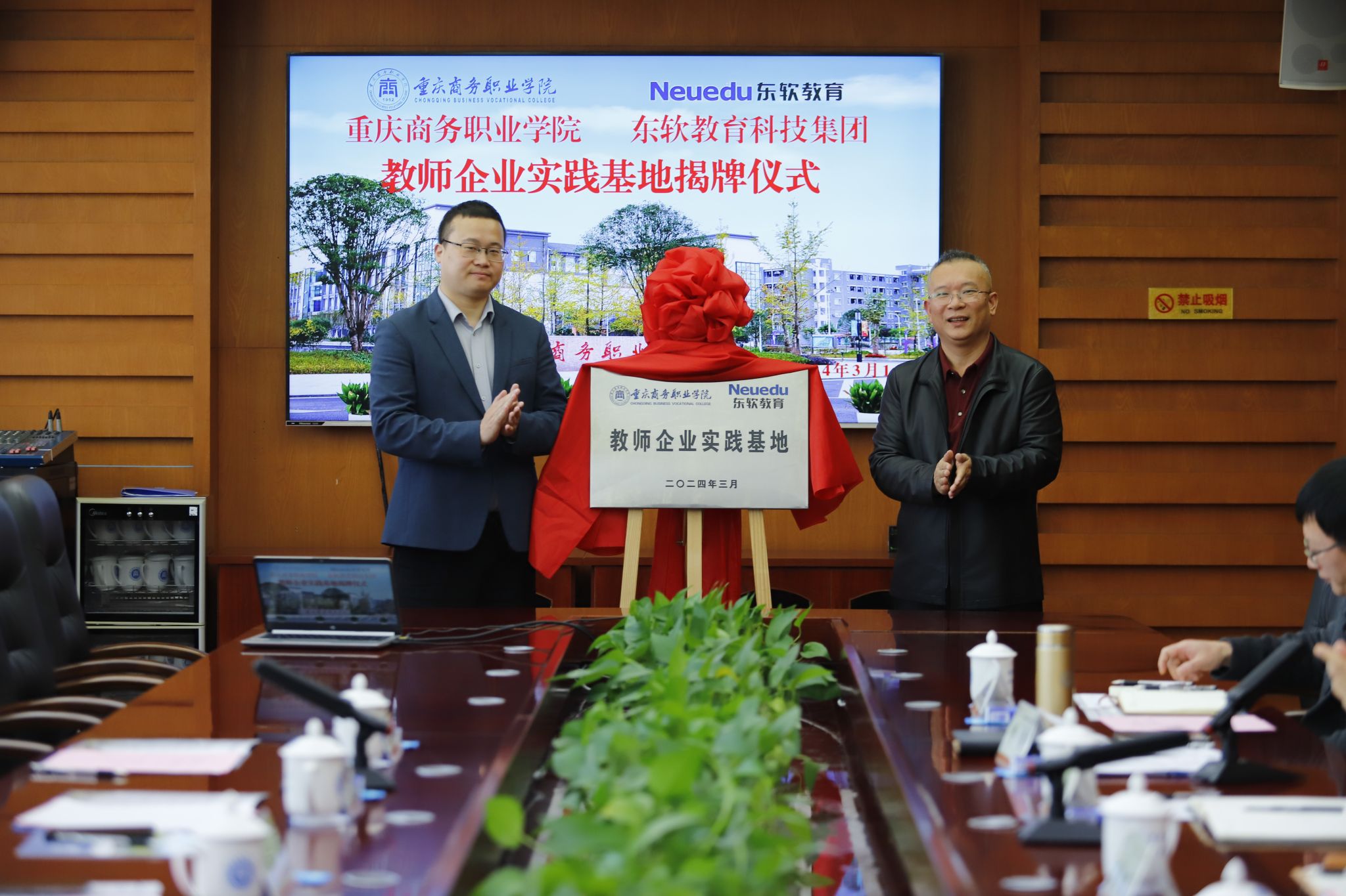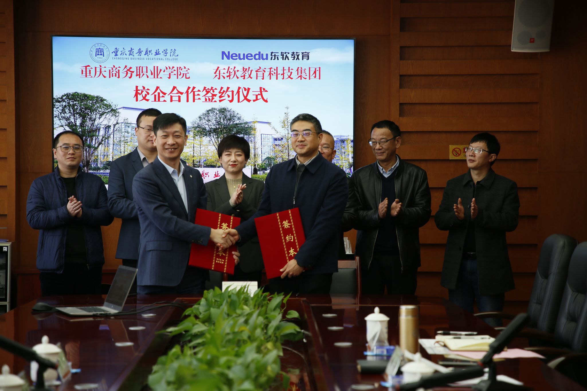 江涛与董本清代表双方签署了《校企合作框架协议》,与会领导共同见证了协议的签署,双方相关负责人分别为“重庆商务职业学院东软人工智能产业学院”“东软教育重庆商务职业学院教师企业实践基地”揭牌。随后,双方进行了深入研讨,并在发展目标、资源共享、师资培养、课程改革、学生实习实训等方面达成了一致意见,这为双方合作务实落地奠定了良好的基础。