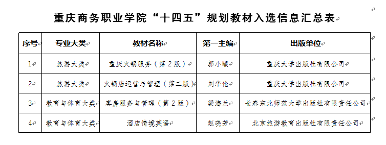 教育部办公厅近期公布了首批“十四五”职业教育国家规划教材书目(教职成厅函〔2023〕19号),我校取得了突破性成果,赵晓芳老师主编的《酒店情境英语》、梁海兰老师主编的《客房服务与管理》、郭小曦老师主编的《重庆火锅服务》和刘华伦老师主编的《火锅店运营与管理》4部教材成功入选“十四五”职业教育国家规划教材。