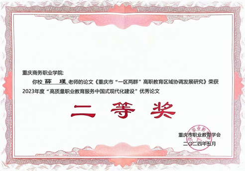 在本次征文活动评选中,我校财经管理学院薛瑾老师的论文《重庆市“一区两群”高职教育区域协调发展研究》获二等奖。