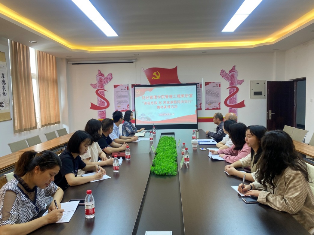 4月27日上午,管理工程教研室邀请学校督导王雪峰教授、副院长张建、思政教师周轶、何慧开展集体备课活动。各位教师就张曦木老师即将开展的 “课程思政”示范课,围绕“备内容、备学生、备教法”进行研讨,充分发挥了团队合力,为提升课程思政教学效果奠定了坚实基础。