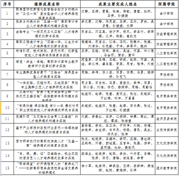根据《重庆商务职业学院关于开展高水平教学成果奖培育项目申报的通知》(渝商职院发[2022] 89号)要求,经团队申报、学院推荐、专家评审,报学校审核,我校15个项目立项为2022年高水平教学成果奖培育项目。