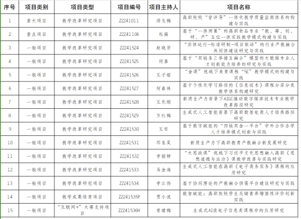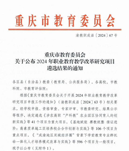 近日,重庆市教育委员会发布了《关于公布2024年职业教育教学改革研究项目遴选结果的通知》(渝教职成发〔2024〕67号)。我校15个项目获批立项为重庆市2024年职业教育教学改革研究项目,其中《高职院校“督评导”一体化教学质量监测体系的构建与实践》立项为我校首个市级资助的教学改革重大项目,《基于“一体两翼”的高职食品专业“教、赛、创、研、产”五位一体实践教学模式构建与实践》立项为市级教改重点项目,《“实体运行-标准研制-项目驱动”的行业产教融合共同体建设研究与实践》等13个研究项目立项为市级教改一般项目。