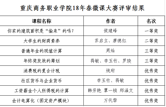 2018年春全校微课比赛结果揭晓,会计学院成绩喜人。本次全校性的微课比赛经历了院系初赛和学校决赛两个阶段,历时近两个月,校外专家对参加学校决赛阶段的微课作品进行了严格的评审,侯建峰老师的《你家的面积是“偷来”的吗?》,苏启立老师的《大学生的财商素养》以及周灿老师的《普通年金的现值计算》、蒋敏老师的《年终奖发放的筹划》分获一、二、三等奖。