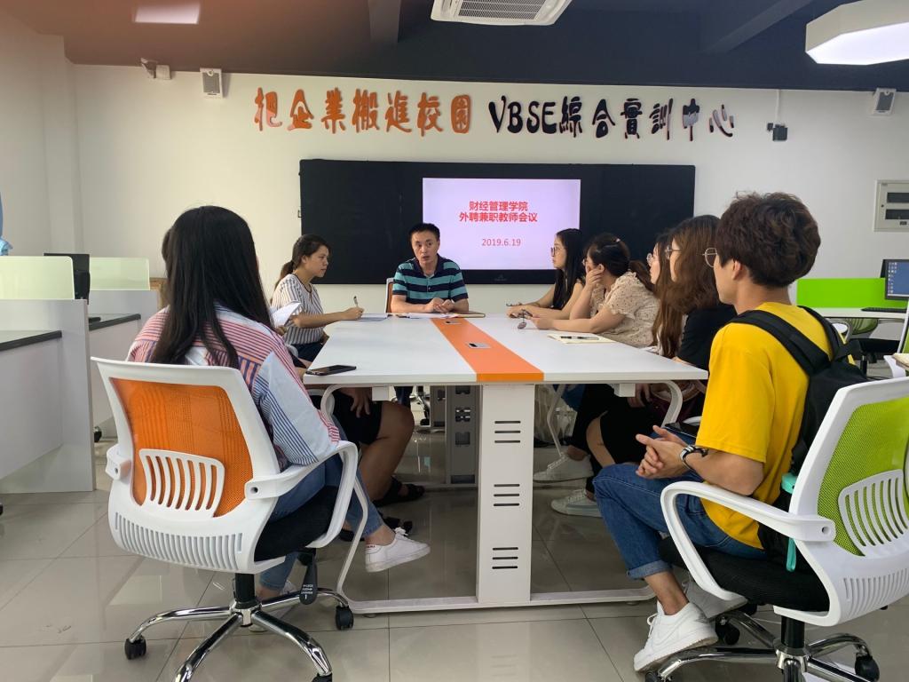 2019年6月19日下午16:00,财经管理学院在实训楼3403召开外聘兼职教师会议,教务办全体成员、各教研室主任,本学期和2019-2020年度第一学期授课的部分外聘兼职教师参加了会议。
