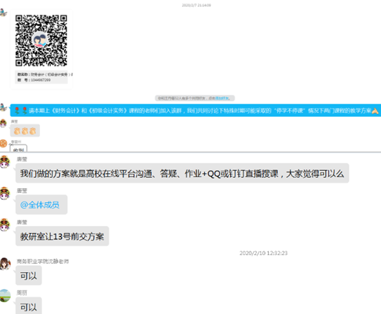 方便交流,创建课程组QQ群。唐莹老师组织大家用腾讯QQ、钉钉等直播平台尝试在线教学,总结经验进行分享;周丽老师作为重庆市级精品在线课程《财务会计》的主持人,在平台上根据老师们各自承担的教学任务创建班级,指导老师们进行班级管理;张帮凤老师主持修订了课程标准,拟定了课程授课计划等教学资料供大家参考使用。