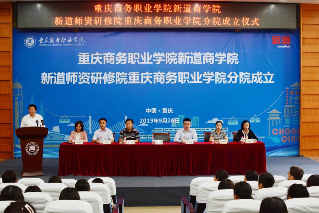 2019年9月26日,重庆商务职业学院新道商学院、新道师资研修院重庆商务职业学院分院揭牌成立。院长冉光学、新道科技股份有限公司助理总裁师伟唯出席,教务处处长李焱、财经管理学院党总支书记黄琳娜、我院师生代表以及来自全国各高校的首期师资研修学员,共100余人参加了揭牌仪式,我院院长苏启立主持了揭牌仪式。