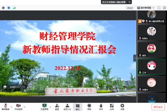 根据商职院教〔2022〕86号《关于考核2022-2023学年新教师指导工作的通知》要求,2022年12月16日下午,学院召开了2022年新教师指导情况汇报会(腾讯会议),学院领导、教务办、专业负责人、新教师、指导老师参加此次会议,会议由副院长张建主持。
