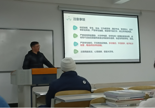 二、精心组织上好课。全体辅导员于25日晚,利用新学期返校的第一时间,围绕思想政治教育、法治教育、校纪校规、生命教育、心理健康教育、习惯养成、内务整理、安全稳定教育、电信诈骗防范,疾病传染防控、生涯规划等积极备课,结合时事热点和学生实际,积极组织上好开学第一课,引导学生树立生命、财产、健康安全意识,教育学生注意用水、用电、消防、交通安全,做好反诈宣传教育,特别强调防止电信诈骗、网络贷款、防溺水等安全事件发生;引导学生把精力和心思放到学业上来,确立学期新目标,做好学业生涯规划。