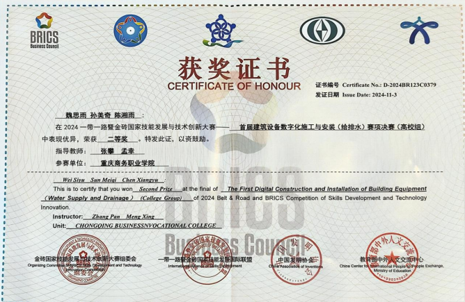 数字化施工与安装(给排水)赛项全国总决赛二等奖