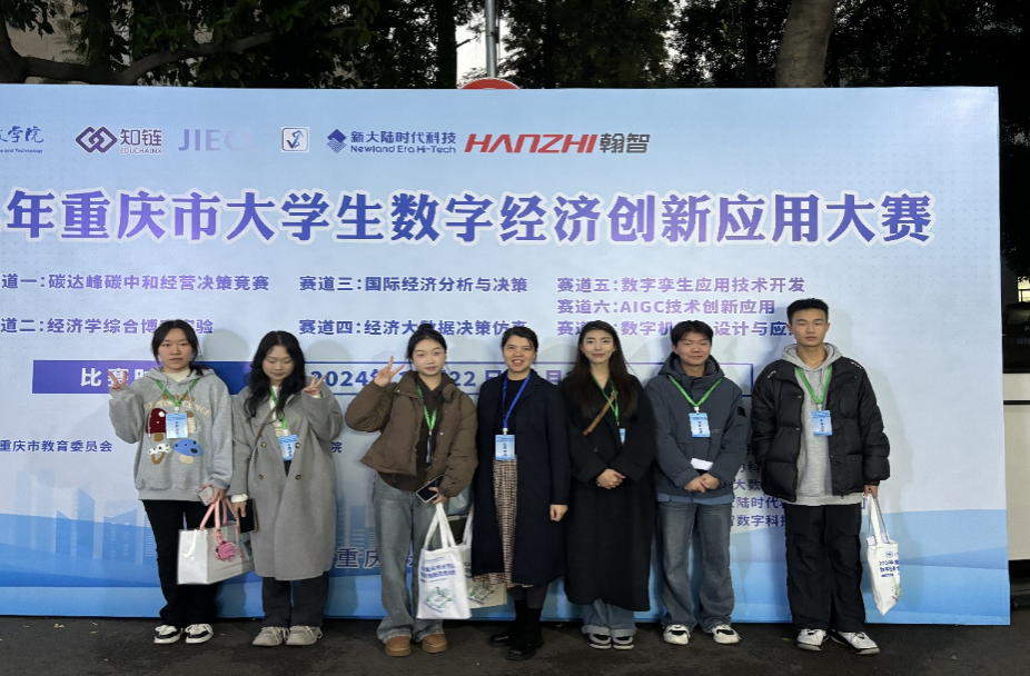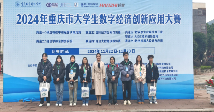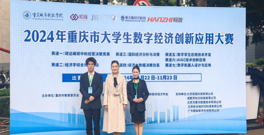 11月22日—23日,2024年重庆市大学生数字经济创新应用大赛在重庆城市科技学院永川校区拉开序幕。唐华、谢沂芹、王云帆、钱敏、姚旭老师指导金融专业群和统计与会计核算专业学生参加赛道一“碳达峰碳中和经营决策”,赛道二“经济学综合博弈实验竞赛”,赛道四“经济大数据决策仿真竞赛”旗开得胜,收获了两个一等奖、两个二等奖,三个三等奖。