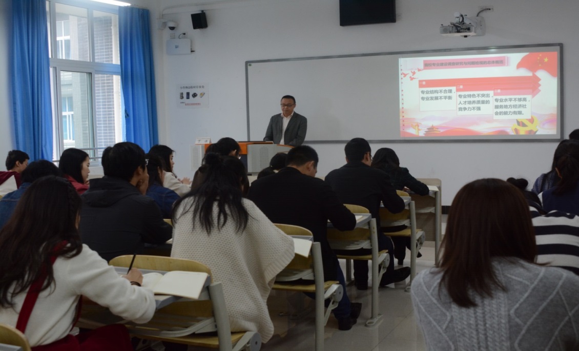丁谦副院长从思想理论指引下的专业发展形势出发,深入分析了我校专业建设发展中存在的问题,立足于“不忘初心,牢记使命”的专业建设思考,提出了“高中起点的学生、面向职业的学习、双师素质的老师、效率高企的学校”四个假设,依据假设一,他认为高职院校要为学生提供高等教育,使学生在三年的学习生活中接受高等教育,成为一个受过高等教育的人,突出体现高职院校的高等教育特性,重点是通识教育和素质教育;依据假设二,他提出高职院校要为学生提供专业教育,使学生有一技之长,成为一个基本上能胜任与专业匹配的对口职业,突出体现高职院校的职业教育特性,重点是凝练本专业的核心技术技能,使教学内容与职业的专业化运动规律相适应;依据假设三,他指出,为了达成以上两个假设前提导引出来的两个目标,教师队伍是保障,需要学校建立教师教学发展平台,为满足高职院校的教学要求,持续培育教师的双师素质和能力;依据假设四,他强调学校的组织效率也是保障,发挥好高校的四大功能才能提高学校的组织效率,只有学校的组织效率提高了才能为学生营造出更好的学习成长环境,重点是基于第一课堂打造课堂体系,使学生在第一课堂、第二课堂、第三课堂、第四课堂等不同的教学场景中成长成才。