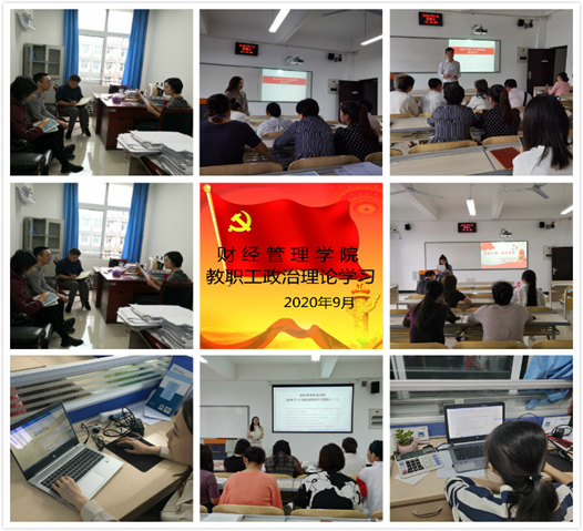 2020年9月16日,财经管理学院按照学校党委宣传部要求,各教研室、党支部、办公室分类别开展了集中统一学习,书记、院长分别深入各学习点,检查学习情况。