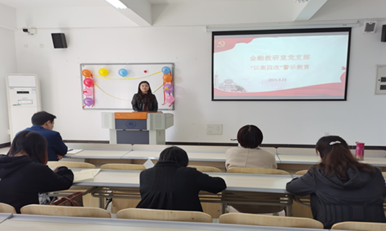 按照学院统一部署,各党支部围绕“以案四说”“以案四改”开展相应学习教育活动。其中金融教研室党支部组织全体党员学习了《关于在全市开展“以案改治理、以案改监管、以案改制度、以案改作风”的实施意见》,观看了《一念之差》警示微电影;会计教研室党支部以秀山土家族苗族自治县举行县委原书记王杰严重违纪违法案进行教育警示,要求党员以反面典型案例时刻警示自己,保持警钟长鸣,要始终紧绷廉洁从教、廉洁干事这根弦,知敬畏、存戒惧,坚守廉洁底线,筑牢拒腐防变思想防线;统会教研室党支部以重庆市黔江区委原书记杨宏伟案开展警示教育,警示各位教师要坚定理想信念,自觉抵制不正之风,不断提升自身素质,用心育人;学生党支部以四川省雅安市雨城区政府党组成员、副区长毛健违规收受管理服务对象名贵特产和礼金问题为例,警示支部党员教师要廉洁自律,守好初心,全心全意为学生做好服务工作。
