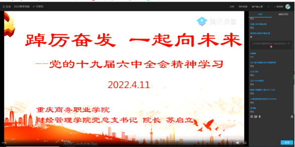 4月11日晚上,财经管理学院党总支书记、院长苏启立教授受邀在腾讯课堂为党校28期入党积极分子培训1班讲授开班第一讲《踔厉奋发 一起向未来——党的十九届六中全会精神学习》专题党课,230余名入党积极分子参加专题学习。