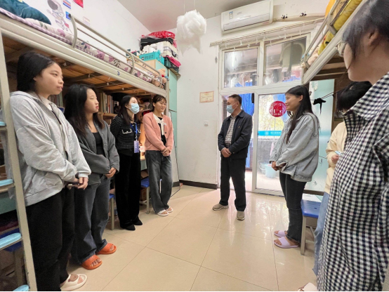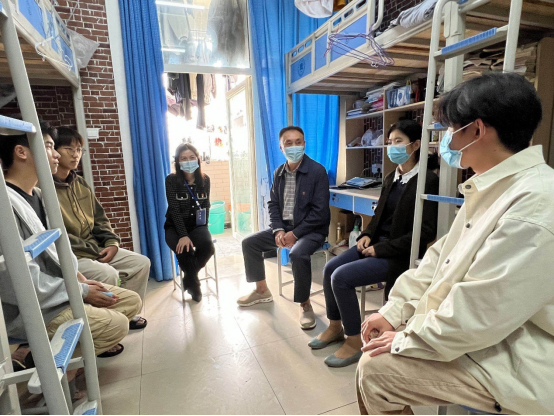 11月5日,党总支书记苏启立带队深入H栋寝室走访,与学生面对面座谈交流,深入了解同学们的学习和生活情况,了解和回应同学们的诉求和建议,教育引导同学们遵守疫情防控规定,做好个人健康管理,合理安排自己的学习和生活。党总支副书记阳春艳、纪检委员胡凤、辅导员老师薛谨参加了走访座谈。