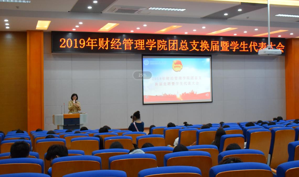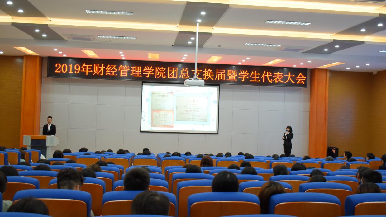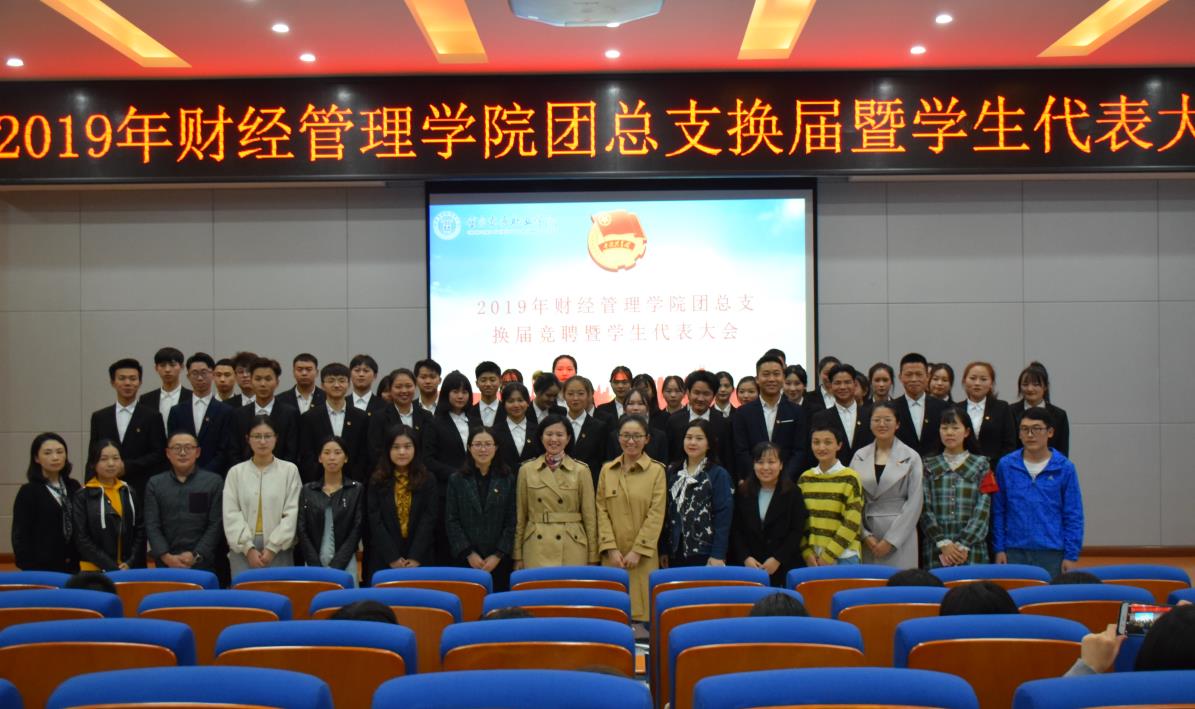 2019年10月15日,财经管理学院团总支换届暨学生代表大会于第二教学楼学术报告厅举行。财经管理学院党总支书记黄琳娜,党总支副书记阳春艳,学团办副主任、团总支书记尚书庆以及财经管理学院全体专兼职辅导员老师莅临现场,校团委学生副书记胡然、财经管理学院、商贸管理系、出版传媒系、餐饮旅游学院学生代表共计280余人参加。