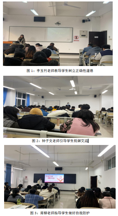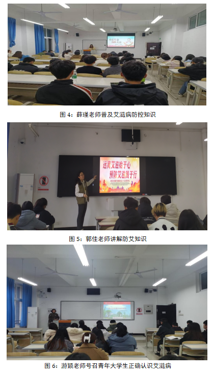 学院全体辅导员以主题班会为重要途径、共担防艾责任,共享健康权利为着力点对学生进行性健康和艾滋病防治教育,为帮助广大青年大学生认识和杜绝传播艾滋病的高危行为起到了重要作用。张秀琼老师通过讲述《青少年性健康和艾滋病防治系列课程——预防艾滋病教育》引导学生掌握健康的生活方式,树立正确的爱情观和人生观,增强自我保护意识;郭佳老师通过防艾知识讲解向同学们介绍了世界艾滋病日的来历、艾滋病的传播途径、艾滋病的预防措施、艾滋病可能对人身健康造成的影响;李玉竹老师通过展示“艾”说心语小艾君的家族发展史系类漫画,教导同学们要树立正确的性道德、性观念;钟子文老师要求同学们远离毒品,切断一切能接触到毒品的渠道,做到洁身自好,自尊自爱才能有效抵御艾滋;胥柳老师通过国家相关政策法规与防艾知识的讲授,指导学生如何做好自我防护,正确认识和了解艾滋病的传播方式与预防措施,养成健康、文明、科学的生活方式;薛瑾老师组织学生观看防艾宣传视频,通过师生互动形式普及艾滋病防控知识,将性道德、性责任、拒绝和预 防不安全性行为作为教育重点;游颖老师向学生讲述防治案例、场景图片以及详实数据,号召青年大学生正确认识艾滋病,积极防治艾滋病。