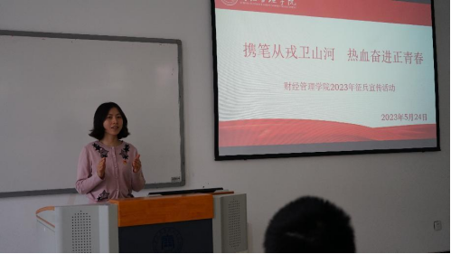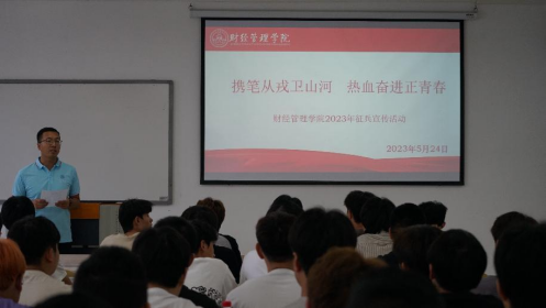 5月24日,学院在2424教室开展“携笔从戎卫山河 热血奋进正青春”主题征兵宣讲会,学院党总支副书记阳春艳、全体辅导员、退役士兵代表、学院应征对象共100余人参会,会议由学团办副主任徐基忠主持。