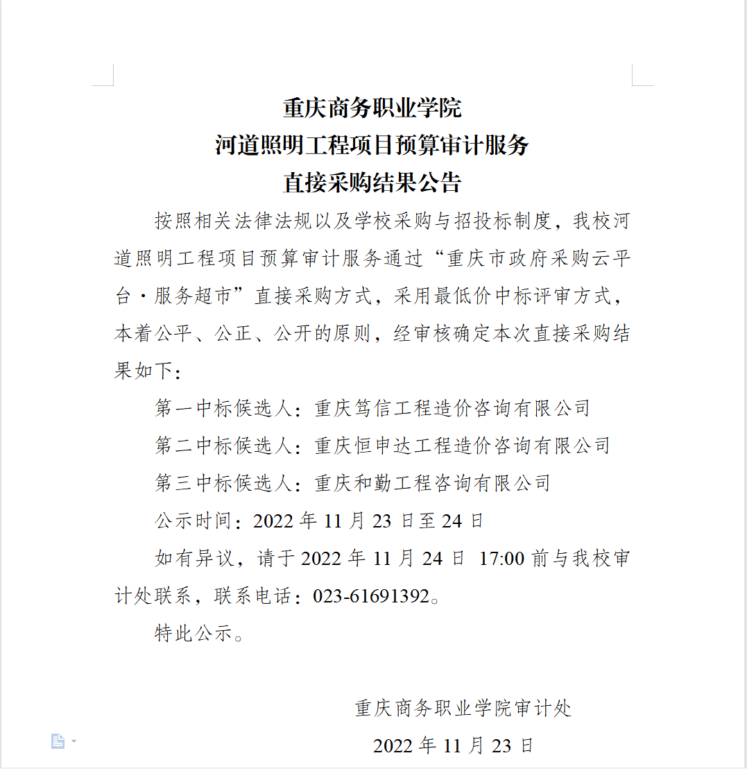 重庆商务职业学院河道照明工程项目预算审计服务直接采购结果公告