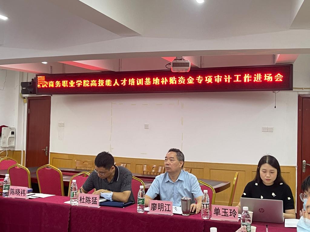 9月14日上午,审计处在南岸校区三楼会议室召开高技能人才培训基地建设项目补贴资金专项审计进场见面会,南岸校区管委会主任廖明江、继续教育学院院长蔡顺林、继续教育学院副院长李晓菊、烹饪学院副院长陈勇、南岸校区综合办、财务处、审计处相关人员以及同芳会计师事务所审计组人员参加会议。会议由审计处处长杜陈猛主持。