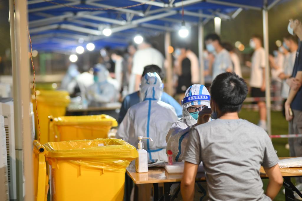 志愿者除了迎接新生志愿服务工作,还承担核酸检测工作,9月12日、9月13日、9月14日连续三天,由志愿者组织所有返校新生在操场有序进行核酸筛查,其中,志愿者们分为三组,一组在每栋寝室楼道与操场维持秩序,一组进入操场的空地进行引导和指示,一组在核酸检测完毕后,疏导大家有序返回宿舍。