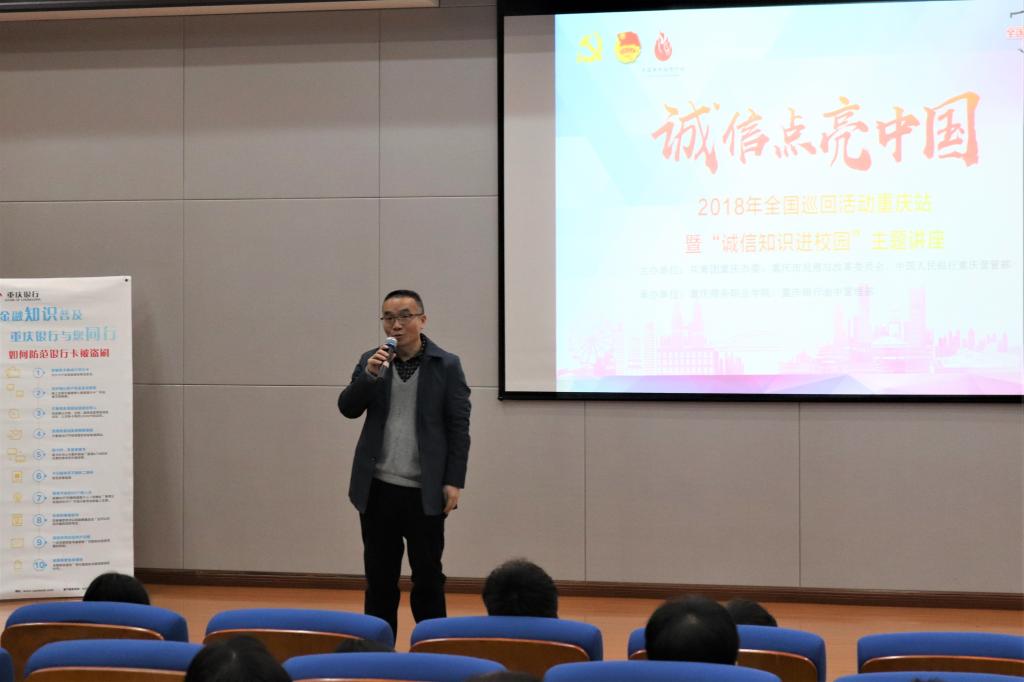 为深入学习贯彻习近平新时代中国特色社会主义思想和党的十九大精神,全面贯彻落实团十八大会议精神,进一步拓宽诚信知识宣传的深度和广度,切实增强青年学生金融安全意识,帮助同学们形成健康的信用消费习惯,11月29日,由共青团重庆市委、中国人民银行重庆营管部主办,重庆商务职业学院、重庆银行渝中管理部承办的“诚信点亮中国”——诚信知识进校园专题讲座在我校第二学术报告厅举行,280余名师生参加了此次活动。